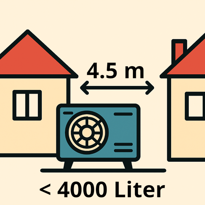 Gemäss den geltenden Vorschriften (z. B. Lärmschutzverordnung) muss ein Mindestabstand von 4.5 Metern zum nächsten Nachbargebäude eingehalten werden.